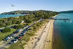 A peninsula (Latin: paeninsula from paene "almost" and insula "island") is a piece of land that is bordered mostly by water but connected to mainland.[1][2][3][4] The surrounding water is usually understood to be continuous, though not necessarily named as such. A peninsula can also be a headland, cape, island promontory, bill, point, or spit.[5] A point is generally considered a tapering piece of land projecting into a body of water that is less prominent than a cape.[6] In English, the plural of peninsula is peninsulas or, less commonly, peninsulae. A river which courses through a very tight meander is also sometimes said to form a "peninsula" within the (almost closed) loop of water.