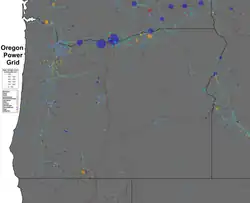 This is a list of electricity-generating power stations in the U.S. state of Oregon, sorted by type and name. In 2022, Oregon had a total summer capacity of 17,243 MW through all of its power plants, and a net generation of 61,317 GWh.[2] In 2023, the electrical energy generation mix was 42.1% hydroelectric, 38.1% natural gas, 14.7% wind, 3.2% solar, 1.6% biomass, and 0.4% geothermal. Small-scale solar, including customer-owned photovoltaic panels, delivered an additional net 515 GWh to the state's electrical grid in 2023. This compares as less than one-third of the amount generated by Oregon's utility-scale photovoltaic plants.[1]