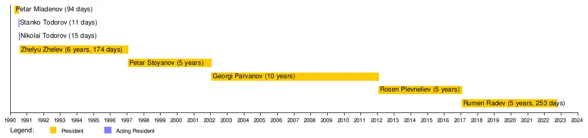 In the Kingdom of Bulgaria, the functions of head of state were performed by the reigning monarch or through a regency. Later, during the communist era, the chairman of the State Council of Bulgaria served as the paramount head of state of the People's Republic of Bulgaria. However, the general secretary of the Bulgarian Communist Party also served de facto representative and executive for the country.[1] The following is a list of presidents of Bulgaria since the modern republic was established in 1990.