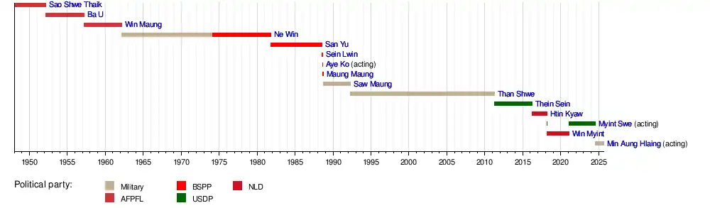 - ^ Took medical leave since 18 June 2024, and formally handed over power to Chairman of the State Administration Council on 22 July 2024.