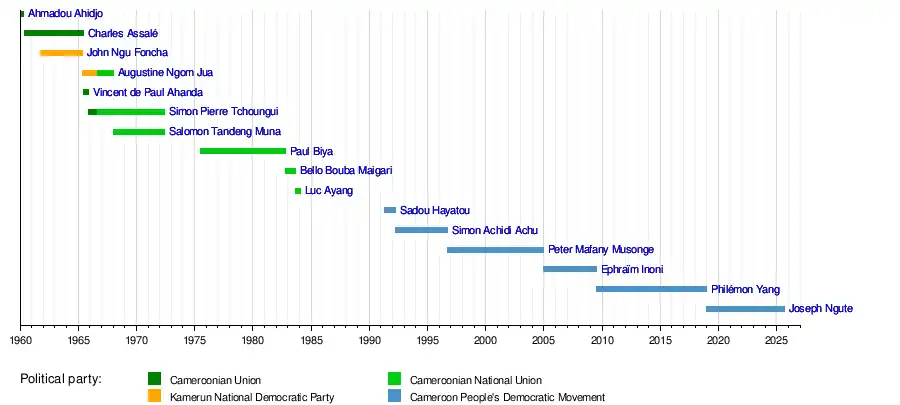 This is a list of prime ministers of Cameroon since the country gained independence from France in 1960 to the present day.