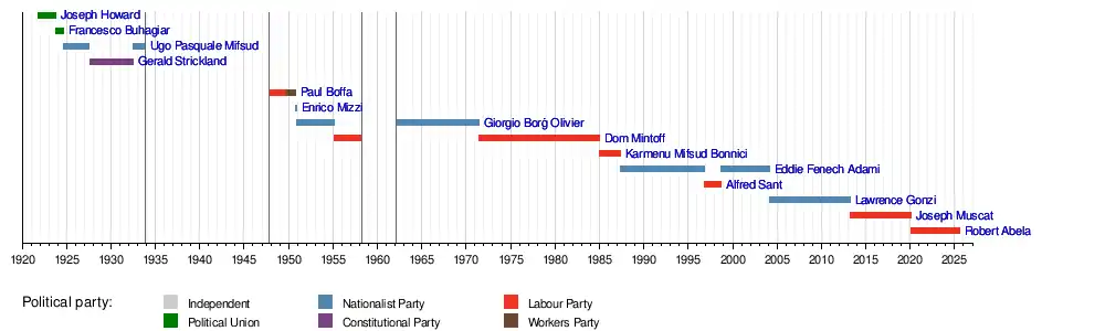 Fourteen people have served as prime minister of Malta since the office was established in 1921. The post did not exist in the period between 1933 and 1947 and also in the period between 1958 and 1962. Joseph Howard was the inaugural holder of the role, while Robert Abela is the incumbent. As of 2022, there have been 5 Nationalist Party prime ministers, 6 Labour Party prime ministers, 2 Political Union-affiliated prime ministers, 1 Constitutionalist prime minister and one Workers Party-affiliated prime minister.
