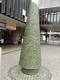 1999 | Robert Conybear and Uta Molling | Cone sculpture | Cast recycled concrete, stone and brick | 3.9m high approx (plus 6m of laser). | Coventry City Council | [2] Carved and painted cone which emits a laser beam up some 6 metres up into the night sky.[12]