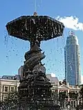 1980 | Peter Shepheard | — | Fountain | — | A fountain in aluminium based on a cast of a George John Vulliamy streetlamp base from the Thames Embankment featuring two sturgeon.[7][8] |