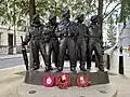 2000 | Vivien Mallock after George Henry Paulin | Christopher Rainsford for HOK International | Sculptural group | — | Unveiled 13 June 2000 by Elizabeth II. The group depicts the five-man crew of a World War II-era Comet tank; it is an enlarged version of Paulin's statuette of 1953 in the Tank Museum, Bovington, Dorset. Mallock's husband had been an officer in the RTR in the 1960s.[32] |