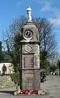 War memorial | Llanfechell | 1920 | John Griffiths | Clock tower with statue | Granite | Grade II | Q29502127 | [27][28]