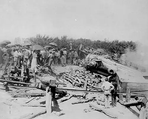 Crash at Crush September 15 – United States – The Crash at Crush – Showman William George Crush convinced officials of the Missouri-Kansas-Texas Railroad (MKT, known as "the Katy"), to let him stage a colossal train wreck. The crowd was transported to the show site, near the town of West, Texas, producing much passenger revenue for the company. A one-day town is thrown up and named Crush, boasting a 2,100 foot (640 m) platform and tank cars supplying 100 faucets. Two six-car trains of obsolete rolling stock, pulled by dolled-up locomotives were let loose at each other over a 1 mile (1.6 km) course with spectacular result. When the wrecked engines' boilers exploded, flying shrapnel killed at least three of the 30,000 spectators (some sources estimate 40,000) and injured many more.