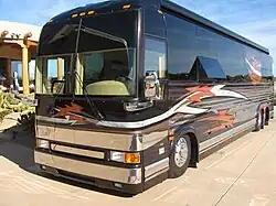 A commercial passenger bus that has been converted into an RV, such as a sleeper bus, tour bus, or a campaign bus.