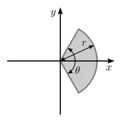 | A filled circular sector of angle θ in radians and radius r with respect to an axis through the centroid of the sector and the center of the circle | ![]() |