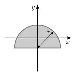 | A filled semicircle with radius r with respect to a horizontal line passing through the centroid of the area |
