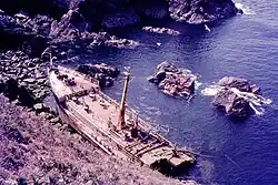 | Point Law | ![]() The coastal tanker ran aground on the south west coast of Alderney, Channel Islands. Her crew were rescued by the St Peter Port Lifeboat, Alderney Fire Brigade, a cliff rescue team and a French helicopter.[31] |