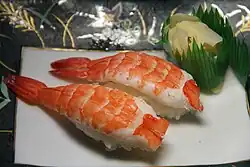 Japan | Hand-pressed sushi, consists of an oblong mound of sushi rice that the chef presses between the palms of the hands to form an oval-shaped ball, and a peeled and boiled shrimp or ebi as neta (topping) draped over the rice ball. | ||||