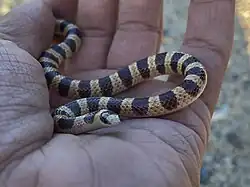 Note: Often lacks red bands - Desert kingsnake (Lampropeltis splendida)