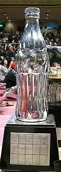 The trophy is a custom made glass mug with a soy sauce barrel design. It is accompanied by a wooden barrel in which soy sauce is traditionally matured.[48] | Yuasa-city | 2011