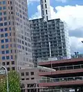 The turn of the millennium would see the completion of Auckland's two tallest skyscrapers at the time, Metropolis, which also became the tallest residential building in New Zealand at 155 m (509 ft), and the Vero Centre, the tallest building in New Zealand overall at 170 m (560 ft). Metropolis marked an increase in the number and proportion of residential buildings on the skyline. While it was praised for its style and quality, the NZ$180 million cost of its construction also led to major financial fallout for its developer.[15] Construction on the tallest building outside Auckland's city centre, Sentinel, was completed in 2008 in Takapuna, a northern suburb across the Waitematā Harbour. The idea of having a landmark building in Takapuna was considered favourably when the developer Cornerstone Group first proposed it in 2003.[16] The Great Recession halted high-rise development in the city for a few years until the mid-2010s.