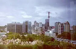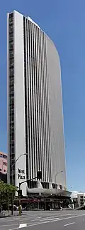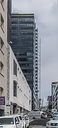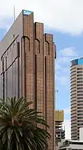 Another building to be called Auckland's first skyscraper was the Civic Administration Building (now shortened to CAB Building), built in 1966. The twenty-storey tower was comfortably the tallest building in Auckland at the time, and housed the city council from its completion until it left in 2014.[5][6] An example of modernist architecture, it incorporated unique building techniques, such as flexible steel framing, aluminium extrusions, neoprene window seals and ceramic acoustic tiles.[7]