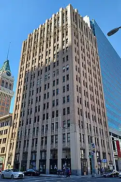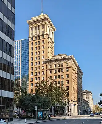The history of high-rises in Oakland began with the completion of the nine-story Bank of America Building in 1907. A nine-story section was later added to the same building.[3] It remained the tallest building in the city until 1914, when the Oakland City Hall, at 320 feet (98 m), became the tallest.[4] At the time it was built, the City Hall was the first high-rise government building in the United States and the tallest building west of the Mississippi River.[5][6] The 390 feet (119 m) Kaiser Center surpassed the height of the City Hall in 1960, and was the tallest building for a decade.[7] In 1989, Ordway Building became the tallest building in the city.