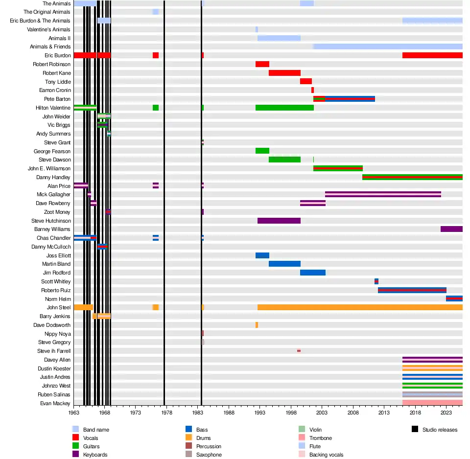 Steel's version includes Steel (since 1994), guitarist and vocalist Danny Handley (since 2009), keyboardist Barney Williams (since 2022) and bassist and vocalist Norman Helm (since 2023). Burdon's version has been active since 2016 and features Davey Allen (keyboards, vocals), Dustin Koester (drums, vocals), Justin Andres (bass, vocals), Johnzo West (guitar, vocals), Ruben Salinas (saxophone, flute) and Evan Mackey (trombone).[4]