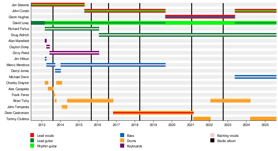 With Hughes as their new frontman, the band issued The Lockdown Sessions EP in July 2020, followed by their fifth album Holy Ground in January 2021.[22] Just two days after its release, it was announced that Castronovo had left due to "medical issues", with Tommy Clufetos returning to take his place on subsequent tour dates.[23] A year later, Clufetos was replaced by former drummer Brian Tichy for a third tenure.[24] In May 2023, Corabi returned and former Whitesnake bassist Michael Devin joined.[25] In March 2024, Tichy was replaced by Clufetos for his second tenure.[26]