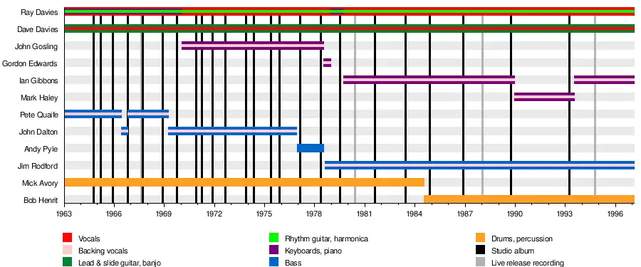 The Kinks are an English rock band from Muswell Hill, London. Formed in January 1963, the group originally comprised the Davies brothers Ray (lead vocals, rhythm guitar) and Dave (lead guitar, vocals), Pete Quaife (bass, backing vocals), and Mick Avory (drums).[1] Quaife left the band for five months from June to November 1966, during which time he was replaced by John Dalton. In April 1969, Quaife left for the second and final time and was once again replaced by Dalton.[2] In May 1970, the Kinks expanded to a five-piece with the addition of John Gosling as their first full-time keyboardist.[3] This lineup remained stable until 1976, when Dalton left.[4][5] The band underwent several lineup changes during the late 1970s, before stabilizing in late 1979 with a lineup of the Davies brothers, Avory, bassist Jim Rodford and keyboardist Ian Gibbons.[6][7] After two more studio albums, Avory left the Kinks in July 1984 following numerous conflicts with Dave Davies, which had culminated in his exclusion from the recording of "Good Day" for their then-new album Word of Mouth.[8] He was replaced by Bob Henrit, who completed work on the album.[1] Gibbons left in 1989, with Mark Haley taking his place beginning with the tour in support of UK Jive.[9][10] Haley remained a touring member, with the 1993 album Phobia recorded as a four-piece.[11]