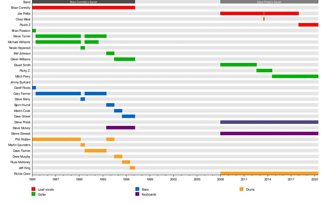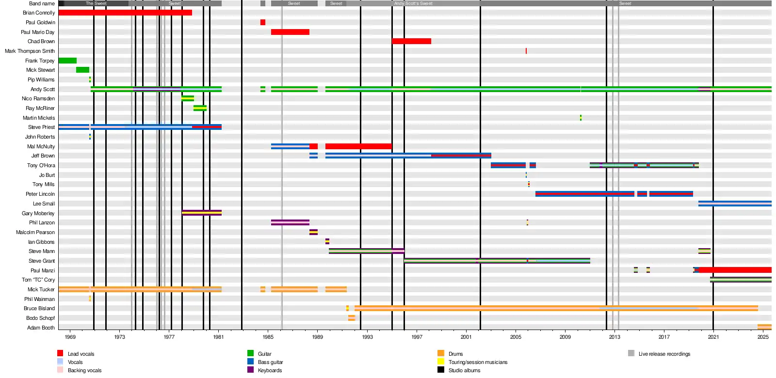 Pete Lincoln left in 2019 and was quickly replaced by O'Hora on bass and Manzi on keyboards and guitar, before O'Hora departed and Manzi did vocals/bass. Steve Mann returned on keyboards and guitar as a guest member, Tom Cory also handled keyboards and guitar and soon became permanent. Lee Small became new bassist and backing vocalist in 2019, with Manzi focusing on lead vocals only. In 2024, Bruce Bisland was replaced by tech Adam Booth, who had previously played drums in 2015 and bass in 2019. In 2025 FM guitarist Jim Kirkpatrick toured with The Sweet as backup guitarist for Scott.[4]