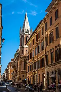 Another of Rome's top shopping streets, it too contains some major fashion boutiques, including Gente, Etro, Emporio Armani and Prada Casual, but also several young designer-wear and knitwear stores, antique shops and jewelers. The street also contains il babuino, one of Rome's speaking fountains (a fountain where several people discuss and voice their political and social ideas). Once, the fountain was covered with political graffiti and different notices, messages and placards, yet, all of this has been removed and anti-graffiti paint has been sprayed around the fountain, since several complained that all the messages and slogans were ruining the appearance of the street. Via del Babuino also contains the Church of England All Saints Church, for Rome's Anglican community. |