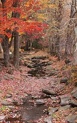 Bowman Creek's main stem is designated as a High-Quality Coldwater Fishery and the watersheds of all but two of its tributaries have the same designation.[4] The watersheds of the remaining two tributaries, Sorber Run and Cider Run, are designated as Exceptional Value waters, with standards even higher than those of High-Quality Coldwater Fisheries.[4][5] Additionally, these two tributaries are the only Wilderness Trout Streams in Wyoming County.[6] Wild trout naturally reproduce throughout all of the creek's tributaries.[7] A total of ten named streams in the watershed of Bowman Creek are classified by the Pennsylvania Fish and Boat Commission as Class A Wild Trout Waters.[8] Most hold this designation for brook trout only, but Sugar Hollow Creek and a section of Roaring Run hold the designation for rainbow trout, either instead of or in addition to brook trout.[8]