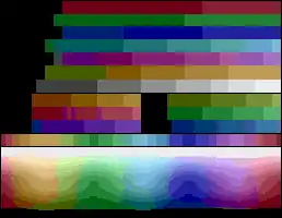 For each unique palette, an image color test chart and sample image (original True color version follows) rendered with that palette (without dithering unless otherwise noted) are given. The test chart shows the full 8 bit, 256 levels of the red, green and blue (RGB) primary colors and cyan, magenta and yellow complementary colors, along with a full 8 bit, 256 levels grayscale. Gradients of full saturation of intermediate colors (orange, yellow-green, green-cyan, blue-cyan, violet, and red-magenta), and a full hue spectrum are also present. Color charts are not gamma corrected.