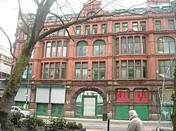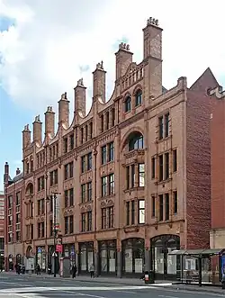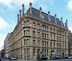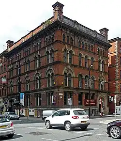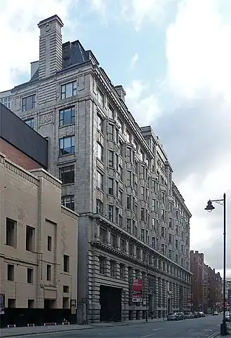 Grade II*. Edwardian Baroque by Harry S. Fairhurst. Interior described as "unusually elaborate" and "probably the best example of its kind in any Manchester warehouse" with Art Nouveau and Venetian Gothic motifs. | 1909 | [38] | |