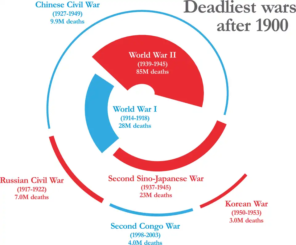 | World War II | 70–85 million[1][2][3] | 1939–1945 | Allied Powers vs. Axis Powers | Global | 3.04%–3.69%[1] |