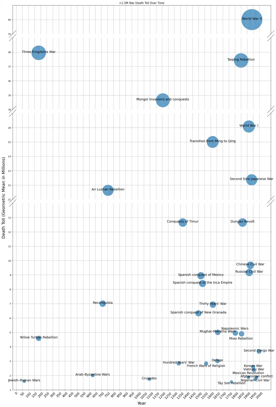 Compiling such a list is further complicated by the challenge of defining a war. Not every violent conflict constitutes a war; for example, mass killings and genocides occurring outside of wartime are excluded, as they are not necessarily wars in themselves. This list broadly defines war as an extended conflict between two or more armed political groups. Consequently, it excludes mass death events such as human sacrifices, ethnic cleansing operations, and acts of state terrorism or political repression during peacetime or in contexts unrelated to war.[a]
