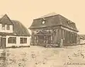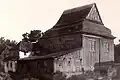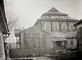 1936 | Traditional synagogue architecture with expressionist elements. The building is not oriented strictly from west to east, but from southwest to northeast. It is 11.85 m long and 7.88 m wide, the outer walls are 6.95 m high. In addition to the traditional synagogue architecture, expressionist elements such as an asymmetrically arranged tower on the southwest corner to highlight the main entrance, high, pointed windows and dormers on the hipped roof were used. There were two stars of David on the tower. The single-story main room was to the southeast; in the northwest there was a two-story construction with three rooms on the ground floor (anteroom to the men's bed room, the staircase to the women's bed room above and a heated room in between). There were separate entrances and smaller square windows. The building had eight large windows: three each on the long sides and two in the southeast, between which the Torah shrine stood. The bima was in the center of the room (slightly offset to the rear). Rows of seats were arranged next to the bima and between the bima and the Torah shrine. When it was converted into a warehouse, the windows were closed with boards, the interior was destroyed and a large gate was added in the southeast.[17] After the Second World War it was used as a warehouse for a long time (after renovations) and has been empty since the 1990s. The synagogue has been restored since 2019. | |