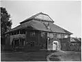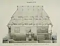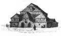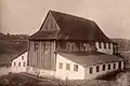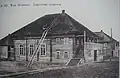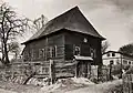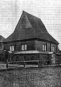 1881 | The elongated wooden building stands on a stone base. The dimensions are 16.19 × 11.62 m with a height of 7.78 m. The prayer room in the southeast was almost square with 11.20 × 10.50 m. In front of it were further rooms in the north-west, above which the women's prayer room was located. Originally the rooms for the women and the main room had a common ceiling. After the Second World War and the murder of the Jewish population in the Holocaust, the building was used as a warehouse and a second ceiling was put in the main room. In the south-west, an asbestos-covered annex was added; entrances have also been changed. Part of the wooden beams on this side were also replaced by silicate bricks. The building was covered with a crooked roof. | |