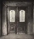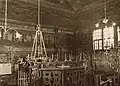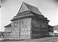 The synagogue is a wooden log structure of rectangular plan, built on a rough-stone concrete foundation and divided into two floors in the west. The structure is spanned with a hipped rafter roof covered with tin. On the exterior, the building is protected with horizontal weather-boarding above the windowsills of the prayer hall, and a vertical one below them.[13] A prayer hall of almost square plan is situated on the eastern side. On the western side, the building includes a vestibule and a small room with a stove, which also heated the prayer hall. A staircase in the southwestern corner leads to a women's section on the first floor, which opens to the prayer hall with two long rectangular windows. The main entrance to the building is in the western wall and the women's entrance is on the southern wall. Ten round-headed windows opened from the prayer hall: three windows on the southern and northern walls and two pairs of windows on the eastern wall. The windows of the vestibule and the women's section are rectangular. The ceilings are joisted flat constructions; that of the prayer hall is supported by two large beams, resting on the western wall of the women's section and the eastern wall of the prayer hall.[14] |