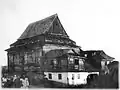 1790–1941 | The building was 28.5 meters long, 19 meters wide and 12.5 meters high. There was a separate section for women in the northern and southern part of the ground floor and in the gallery. The walls were richly decorated with biblical verses and prayers. The vault was especially richly decorated. Following the example of Polish landowners' seats, at the façade there were corner alcoves, often used in synagogues in the mid-18th century. Between the two wars, Professor Oskar Sosnowski of the Department of Architecture of the Polytechnic of Warsaw, and photographer and art historian Szymon Zajczyk directed architects to create extensive documentation of the wooden synagogues. They created architectural drawings, replica paintings, and photographs. Much of this project was destroyed during World War II but a substantial amount survived.[5] The synagogue in Hrodna was measured and photographed in 1928. | ![]() ![]() ![]()