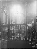 1770[1]: 62 –1913[27] | The layered, pitched roof visible in surviving exterior photographs conceals a series of massive trusses from which the great dome was suspended.[28] The roof, which features three well-defined stages, was considered one of the most architecturally complex and interesting of wooden synagogue roofs.[29] The synagogue was enlarged in the nineteenth century by the addition of one story extensions on each side for the use of the women of the community.[28]: 231–2 |