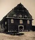 1801[19] | Together with another wooden synagogue and a Shtibl, also made of wood, it formed the Shulhoyf; the ensemble survived two fires in the 19th century. The German occupiers detained the Jewish population on the site (July 1941), from where they were brought to Morkakalnis and murdered there. The building ensemble still existed in the post-war period, the Shtibl was demolished in 1970, and the second synagogue before 1997. After being vacant until 1954, the building was used as a cinema until 1971, then a gymnasium, shop and was finally empty again. After a fire in 2009, the wooden building was renovated in 2014. The reopening took place in May 2017 in the presence of the Israeli ambassador and other dignitaries.[20] It was an early classicist wooden building with a mansard roof. The vestibule with the winter synagogue lied in the northwest, above it, slightly protruding and supported by two wooden Doric columns, the women's gallery. The barrel vault was painted around 1895. | |