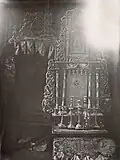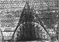 It consisted of a square (12 × 12 m) large main hall. The walls were 6 m high; it was 10.20 m to the highest point of the vault, and the floor was a few steps lower than the outer rooms. On the west side there was a vestibule and above it a gallery with arcades. A two-story corner pavilion stood to the right and left. The north and south sides were flanked by women's dreams. The main building had a three- story tent roof, with the upper step transitioning to an octagonal point. The corner pavilions had a two-story roof. Inside, four wooden pillars supported the vault; they divided the floor plan into nine equally sized fields. In the middle stood the bima; it was in the shape of an octagonal arbor with a canopy with a crown on the top. | ![]()