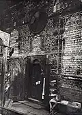 1750–1941 | The synagogue building was a wooden structure built on a stone foundation. The walls of were cut from edged logs into a clean corner. The central log house was dominant in height, to which side log houses were adjoined as covered galleries. A pentagonal structure was added to the main facade, which covered the main entrance. The building was covered with a high gable roof, with a complex plan and numerous outbuildings. In the end of 19th - beginning of 20th century the roof was covered with tin.[6] The interior was almost entirely covered with magnificent polychromes made in 1745 by the Słuck painter Chaim ben Yitzchak ha-Levi Segal. Murals, made on boards, represented the images of 12 signs of the zodiac, mythical animals and cities. Some researchers noted that under the image of mythical cities features of Mogilev from the times of the Polish-Lithuanian Commonwealth were visible. These murals were studied by El Lissitzky and Issachar Ber Ryback. | ![]() ![]()