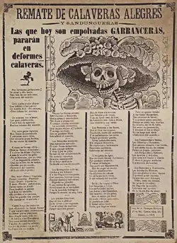 The Literary Calavera or calavera literaria (Spanish: literary skull) is a traditional Mexican literary form: a satirical or light-hearted writing in verse, often composed for the Day of the Dead.[1][2] In some parts of Mexico, it is a common tradition for children and adults to write "Calaveritas" (Spanish: little skull) for friends, colleagues, or relatives, in which the addressee is typically portrayed as dead.