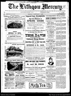 The Lithgow Mercury was established in 1878.[1] Initially a weekly publication, the paper was published daily from 1949 to 1986, then tri-weekly. In 1879, the paper was purchased by Walter Scott Targett, who had started work as a compositor on the paper, and who was later elected to the New South Wales Legislative Assembly as the Member for Hartley.[2] J.P.T. Caulfield acquired the paper in 1886. He worked as editor for eighteen months, until late 1887 when he sold the paper to the proprietors of the Lithgow Enterprise and Australian Land Nationaliser.[3] In January 1889, the Lithgow Mercury Newspaper Co., headed by James Ryan, purchased the business and property of the Lithgow Enterprise. Ryan became managing editor of the paper, a position he held for over 37 years. In July 1926, Western Newspapers Ltd, led by L.T. Watson, Hubert Browett Whitham and F.V. Sparrow, purchased the plant and book debts of the paper.[4][5] The Lithgow Mercury is currently owned by Fairfax Regional Media.[1]
