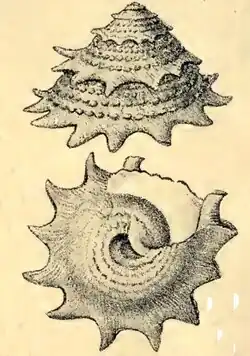 The size of the shell varies between 40 mm and 60 mm. The imperforate, solid shell has a turbinate shape. The 6-7 whorls 6- are, flat above, obliquely costate below the sutures, then with several revolving series of granules. The periphery is sharply carinate, armed with short triangular spines which festoon the sutures and project more or less, about 10–13 in number on the body whorl. The base of the shell is a little rounded, radiately lamellose striate and concentrically lirate with three to five lirae, mostly tuberculate, especially in the young. The oval aperture is transverse, channelled at its outer angle. The short columella is arched. The place of the umbilicus is excavated, whitish, bounded by an intensely orange vermillion tract.[3]