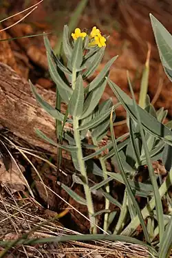 It is a hairy perennial herb growing from a taproot and woody caudex. It produces a clump of branching, spreading stems up to about 40 centimeters long. The stems are lined with widely lance-shaped, lightly hairy leaves up to 5 centimeters long. The flowers appear near the ends of the stem branches, each with a calyx of narrow, pointed sepals. The corolla is bright golden yellow and nearly a centimeter wide at the mouth.