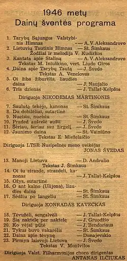 - ^ a b c d e f g h Marcinkevičius, Juozas (2005). "Tautiškos giesmės likimas prijungus Lietuvą prie Sovietų Sąjungos(1940-1950)". Lietuvos himnas (PDF). Vilnius: Lietuvos nacionalinis muziejus. ISBN 9955-415-23-1. Retrieved July 29, 2018.