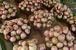 The fruit is eaten raw or cooked, and the tree is sometimes cultivated for its fruit. When eaten raw, it is rolled in the hands or hit with a spoon to cause slight bruising in order to release the flavor.[10] A popular way of eating the fruit is to submerge it in hot water for five minutes, then sprinkle it with salt. It is sometimes served steamed with rice. Unripe fruits are pickled.[9] An oil is extracted from the seed, which is used to make candles and soap. The wood is used in construction.[8] Litsea garciae has many medicinal uses. The Iban use the lightly burned bark to treat caterpillar stings, and use a bark poultice to treat boils. The Selako use a poultice of the leaves or shoots along with shallot and fennel seeds to cure infections and skin diseases. It is also used to treat skin burns. The Penan use a bark poultice for sprained knees, ankles, and muscular pains. Decoctions made from the bark are also used to help ailments such as blood in stools, and are mixed with durian bark to make an antidote for snakebite wounds.[3]