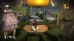 LittleBigPlanet Karting is a racing game in which the players race against each other in a go-kart across a variety of themed tracks, with the primary purpose to come in first place.[3] Throughout the course of the race, players can pick up weapons that have special abilities such as projectiles, heat-seeking projectiles, EMPs, and grenades. The player can use these weapons to attack and slow down competitors.[4] Weapons can be fired both forwards and backwards and can even cancel out seeker missiles when fired in reverse. Players can also pick up boost items such as Autopilot and Fast Forward.[5] Karting includes LittleBigPlanet 2's grappling hook mechanic during races. Players are required to grapple across large expanses, climbing through the environment to progress and occasionally even finding elevated shortcuts.[5] Players have the ability to reach out and slap somebody, stunning racers who get too close.[4]