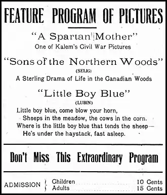 - ^ "Licensed Film Stories - Lubin - Little Boy Blue (May 6)". Moving Picture World. New York, Chalmers Publishing Company. May 4, 1912. p. 443. Archived from the original on July 13, 2011. Retrieved February 29, 2024.