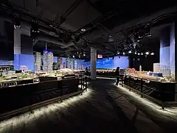 The Toronto destination, which took over 35,000 hours to design and build, includes GO Transit trains and Union Station,[11] the Art Gallery of Ontario, Toronto City Hall,[4] helicopters, streetcars,[3] the Don Valley Parkway,[4] and the Gardiner Expressway.[5] During the morning portion, sound effects include chirping birds, barking dogs, and garbage trucks making rounds.[3] During the sunset portion of the exhibit, the skyline is lit by 30,000 LEDs,[3] with sounds of crickets and sirens.[8] The replica of the Rogers Centre, which cost $60,000 to build and occupies a space of 5 by 5 feet (1.5 by 1.5 m),[5] has a functional retractable roof and contains a scoreboard that will show highlights from the preceding day's Toronto Blue Jays game.[3] The field depicts the instance Joe Carter hit a walk-off home run to clinch the Blue Jays' victory in the 1993 World Series against the Philadelphia Phillies.[8]