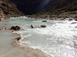 According to a streamflow gauge near Cameron, before the river enters the Grand Canyon, the river's average annual flow was 367.2 cubic feet per second (10.40 m3/s) from 1948 to present. The highest annual average was 1,127 cubic feet per second (31.9 m3/s) in 1973, and the lowest was 14.1 cubic feet per second (0.40 m3/s) in 2000.[8] The river's peak flows can be far higher than its average flow, because of quick desert runoff from cloudbursts. At the same gauge, peak flows were recorded from 1923 to 2008, with spotty data from 1924 to 1947. The highest recorded peak was 120,000 cubic feet per second (3,400 m3/s) on September 20, 1923, while the lowest was 1,590 cubic feet per second (45 m3/s) in 1974.[9]