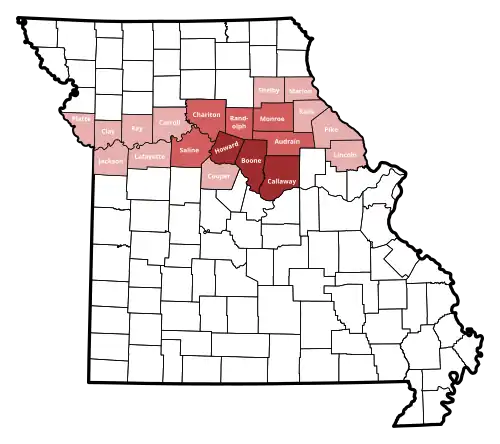 A 1948 article in the Missouri Historical Review defined the antebellum "Little Dixie" region as a 13-county area between the Mississippi River north of St. Louis to Missouri River counties in the central part of the state (Audrain, Boone, Callaway, Chariton, Howard, Lincoln, Pike, Marion, Monroe, Ralls, Randolph, Saline, and Shelby counties).[2]